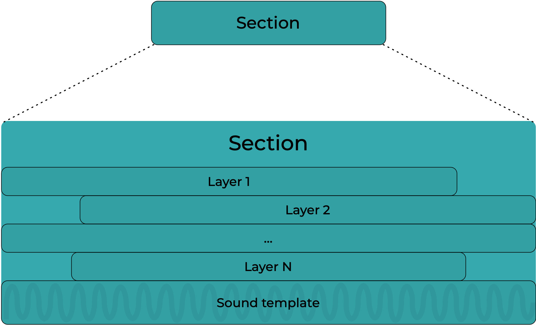 Each section contains one or more layers playing together. It has an optional sound template (or sound bed) that will play in the background of the section, and will play for the duration of the section: