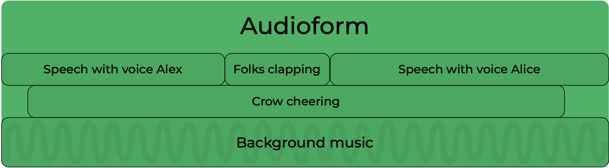The audioform arrangement is designed to be flexible: it can adapt to its content (the assets) but can also have timing constraints such as: