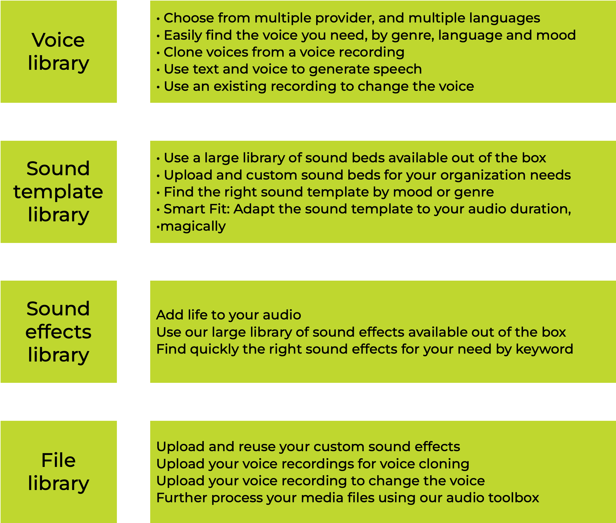 - Sound template library (Audiostack, and User-defined): use sounds beds for your audio.